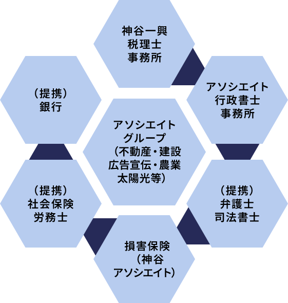 が中心となり、長年にわたる経験により、起業や経営の初期段階で必要な専門的アドバイスを提供できるほか、グループ内外のネットワークを活用し、提携先の士業(弁護士、司法書士など)による法務や手続き支援も行うことができます。加えて、長年の取引実績を持つ金融機関との連携を活かし、資金調達や財務面でのアドバイスも提供できます。